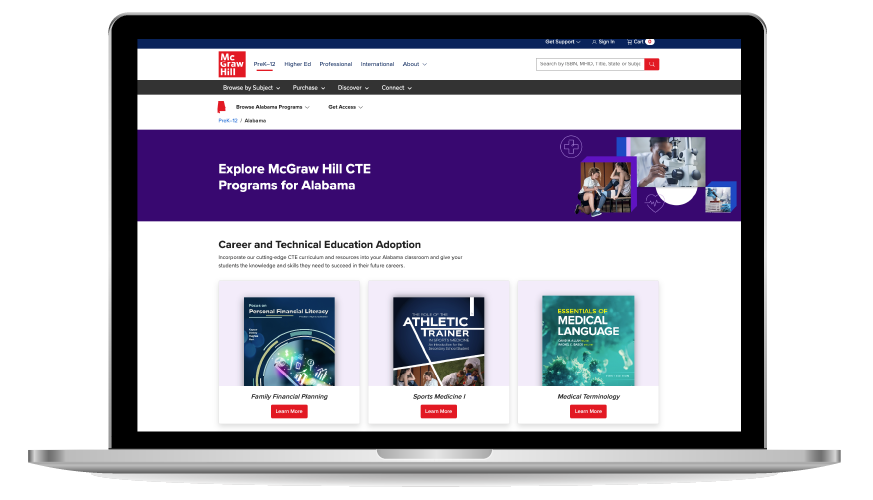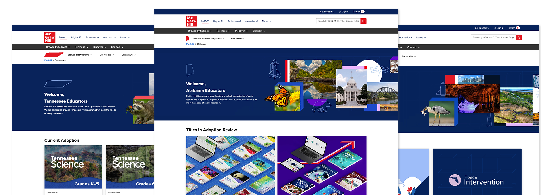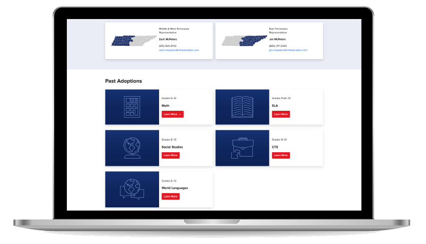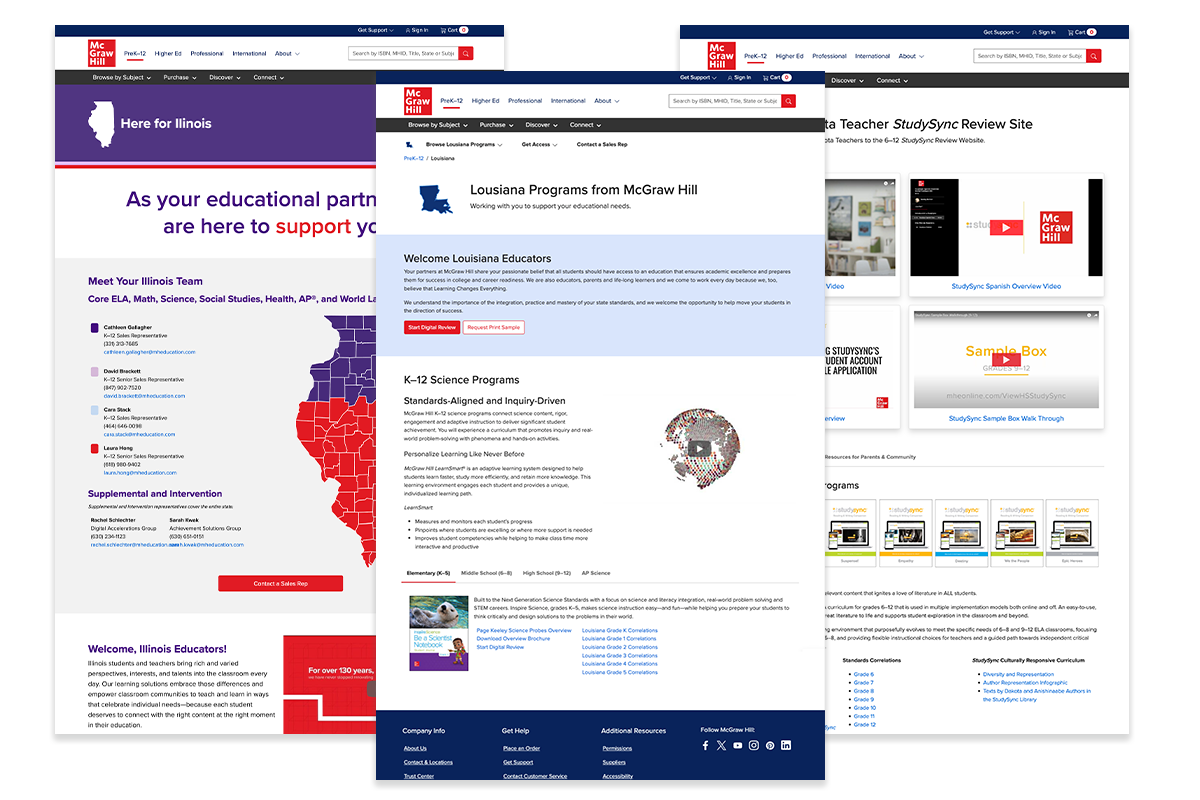 During my deep dive, I found some state sites didn’t have a general state landing page instead, they just dropped customers into the single subject adoption 1-2-3 sample page. Other pages hosted all the different subject adoption content on the home page. Even others had selection cards for each program that McGraw Hill bid for a state subject adoption.